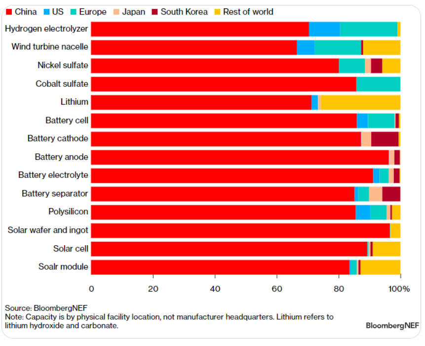 China Extends Dominance of Clean-Tech Supply Chains (Despite Onshoring Push): BNEF data says China's share of global manufacturing capacity is now above 80% in 11 clean-tech segments.