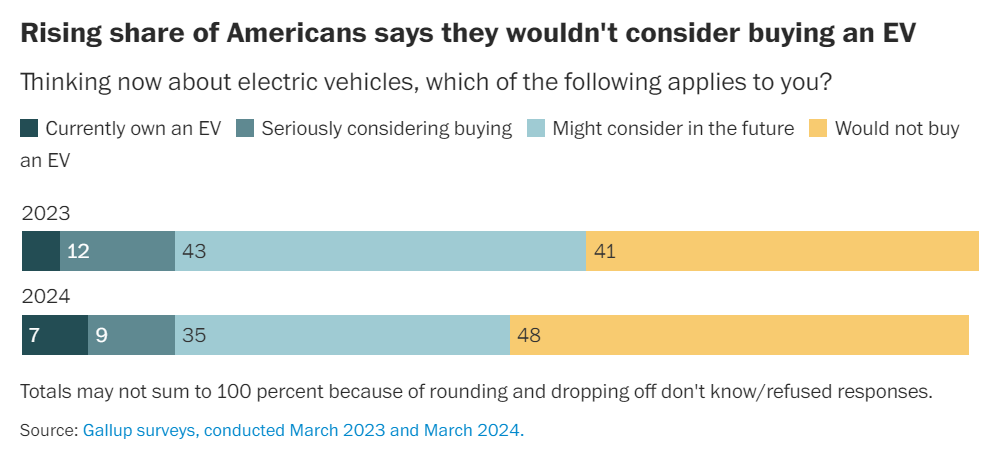 WaPo Columnist: EVs Have a Dem Problem – In a new column, Washington Post columnist Catherine Rampell writes electric vehicles might have a Democrat problem. In the past year, Democrats have become much less likely to say they would even consider buying an EV. the share of Americans saying they would not even consider buying an EV jumped, from 41% in 2023 to 48% today, according to a Gallup report released last week.