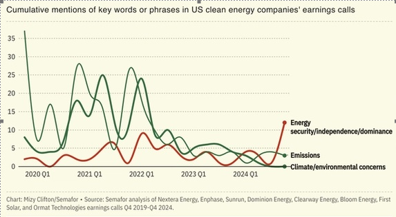 Using “Climate” Less, Energy Dominance More: A Semafor Analysis reviewed eight companies — a combination of energy providers, owners of electricity generation assets, and technology manufacturers — use of the terms “emissions” and “climate” and/or “environment” fell from a cumulative high of 45 across the companies’ earning calls in early 2020 to just three by the beginning of this year. By contrast, the terms “energy security,” “energy independence,” and “energy dominance” grew in use, from just two in early 2020 to 12 by the beginning of this year.