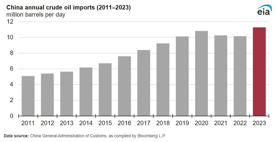 China & Oil: EIA says China's crude oil imports hit a record last year, becoming the world’s largest importer of crude oil. It imported 11.3 million barrels per day (b/d) of crude oil in 2023, 10% more than in 2022. Russia, Saudi Arabia and Iraq were China’s main sources of crude oil imports in 2023.
