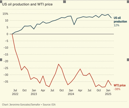 EIA: Prices Dopwn, But Production Still up: Semafor charts EIA data showing that investors aren’t spooked by a recent plunge in oil prices and oil-company shares. Most are guessing that the US is still headed for more drilling as President Donald Trump chases an “energy dominance” agenda.