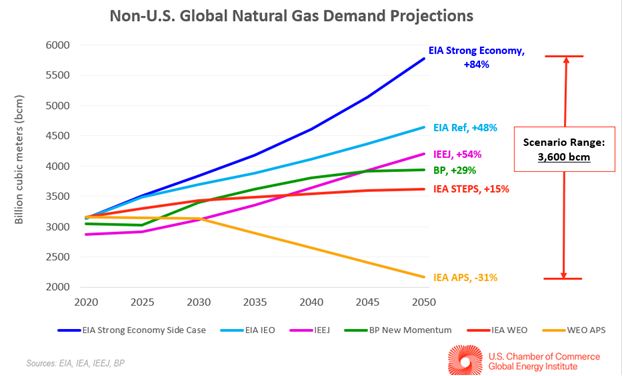 NatGas Demand Will Still be Strong: Europe Still will need natgas well into the future even with energy transition programs in full force. At last week’s Senate Energy hearing, DOE’s David Turk cited as evidence of demand needs a side case from the IEA that assumes every country meets its NDC (which it admits is a highly unlikely scenario). This chart tracks gas demand across 4 different models (IEA, EIA, BP, and IEEJ), where all of their reference cases show significant increases…even IEA. But DOE’s own EIA shows the largest projected demand increase giving Sen. Barrasso reason to chide Turk for not using his own EIA data. “So you’re disputing your own department?”