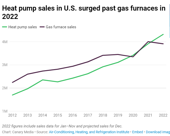 Heat Pump Sales Strong: Recently released industry data from Air-Conditioning, Heating and Refrigeration Institute (AHRI) shows that heat pumps outsold natural gas furnaces in 2022, driven in part by incentive programs in states like Maine, Massachusetts and California Canary Media reported. It is important not to overread this stat though. These numbers do not account for boilers, which are widely used in the northern states.