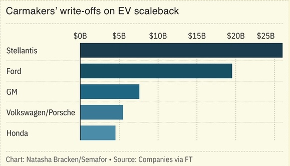 EV Write Downs are Significant: Carmakers registered $65 billion in write-offs globally as companies were forced to overhaul their EV investments, squeezed by a pivot in US climate policy and an overstated enthusiasm for the green transition