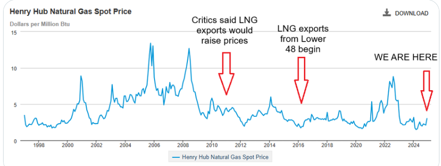 No Evidence That Exports Hurt Prices: The historical view of the Henry Hub spot price shows little impact on price from additional exports.