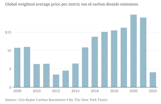 Coy: Cost of Emissions is Higher – In his column in the New York Times, Peter Coy writes the below chart shows a steep drop in 2022 in the global weighted average price per metric ton of carbon dioxide emissions: