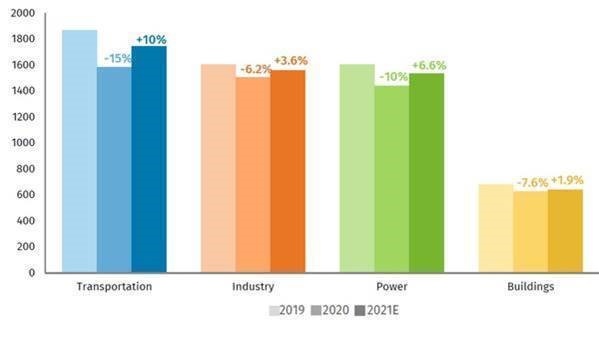 2020 Emissions Grew: While we expected GHG emissions in the US would increase as we recovered from COVID, they increased 6.2% relative to 2020 (all sectors), largely due to an increase in coal-fired power generation. Emissions by major emitting sector, in million metric tons CO2e and % change: