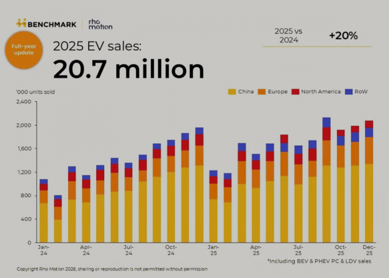 EVs still Growing InA No Demand Market: Rho Motion’s latest numbers show global electric vehicle sales hit 20.7 million in 2025, up 20 percent year on year. Europe surged 33 percent. China grew another 17 percent. The rest of the world nearly 50 percent. Even with a wobble in North America, the global picture is clear: people are still buying EVs in very large numbers.