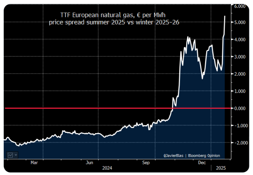 EU Nat Gas Woes: Javier Blas of Bloomberg has a chart with European gas summer 2025 vs winter 2025-26 price spread is flying >€5 per MWh in his recent opinion column. He writes it is an accident waiting to happen. The result of depleting inventories too quickly this winter coupled with EU mandates to re-build them.