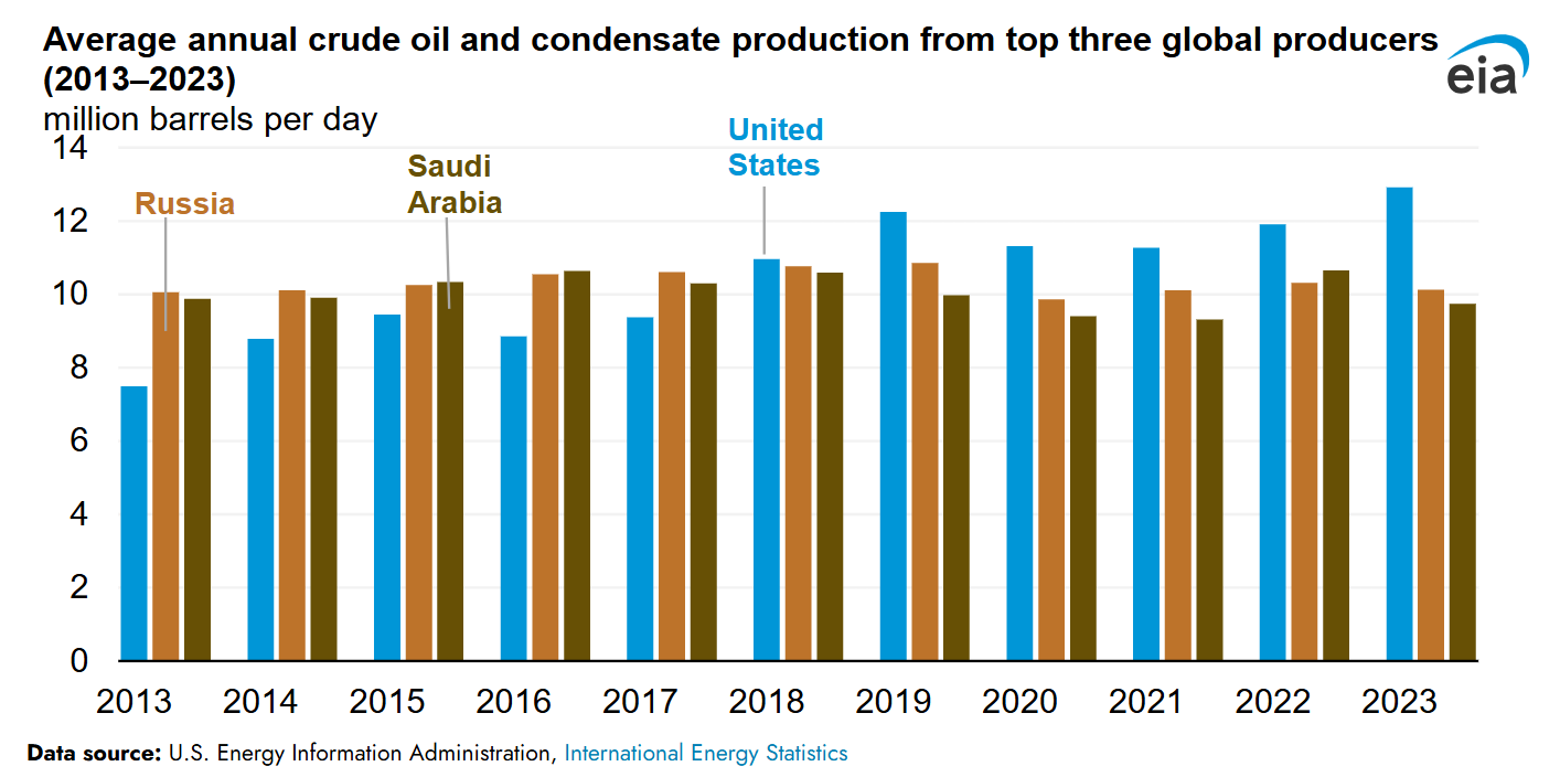 EIA Highlights in STEO in 2024: The US produced more crude oil than any nation at any time, according to EIA’s International Energy Statistics, for the past six years in a row. Crude oil production in the United States, including condensate, averaged 12.9 million barrels per day (b/d) in 2023, breaking the previous U.S. and global record of 12.3 million b/d, set in 2019. Average monthly U.S. crude oil production established a monthly record high in December 2023 at more than 13.3 million b/d.