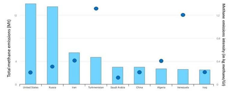 Methane Emissions: Oil and gas methane emissions by total (bar) and intensity (dot) of production.