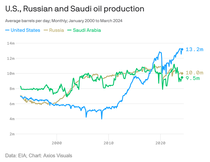 US Oil Production Surpasses Others: Estimates from EIA show that the U.S. is already the world's largest oil producer — it's not close anymore, as you can see in this Axios chart — the largest gas producer, and the largest LNG exporter.