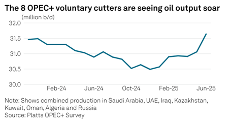 West Refineries Present Price Increase Risk: The most recent Platts OPEC+ survey from S&P Global Commodity Insights finds that the alliance’s crude oil production shot up by 600,000 b/d in June, driven by a 400,000 b/d increase in Saudi Arabia. The increase – which took OPEC+ output to 41.79 million b/d, the highest since December 2023 when Angola was still a member – came at a time when the Israel-Iran conflict threatened the security of global supply.