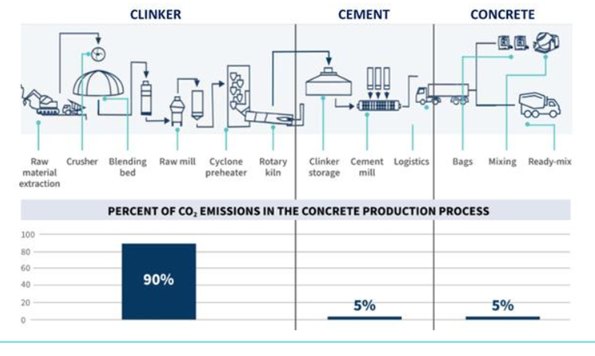 Cement/Concrete Emissions – The concrete and cement industry accounts for 7-8% of global CO2 emissions, and most of that total CO2 comes from the first three phases of the "clinker" production process: 1) preheating, 2) calcination, 3) clinker mineral formation.