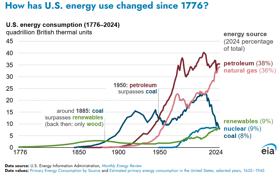 July 4th EIA Special: US Energy Use Since 1776: In 2024, the United States consumed about 94 quadrillion British thermal units (quads) of energy, a 1% increase from 2023, according to EIA’s Monthly Energy Review. Fossil fuels—petroleum, natural gas, and coal—accounted for 82% of total U.S. energy consumption in 2024. Nonfossil fuel energy—from renewables and nuclear energy—accounted for the other 18%. Petroleum remained the most-consumed fuel in the United States, as it has been for the past 75 years, and nuclear energy consumption exceeded coal consumption for the first time ever.
