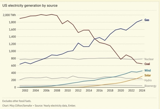 NatGas, Solar Continue Roll: Wind and solar energy together produced a record 17% of US electricity last year, overtaking coal for the first time, an Ember review found.