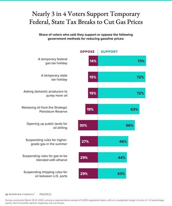 Poll: Support for Gas Tax Cuts, More Drilling: A Morning Consult/Politico survey from last week shows amid rising gasoline prices, government and energy officials have proposed several options for how to bring the costs down. The survey found that, out of a list of eight options, voters were most likely to support temporary breaks from paying federal taxes on gas (73%) and state fuel taxes (72%). Nearly 3 in 4 voters (72%) also said they would support a push by the federal government for domestic producers to pump more oil.