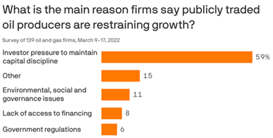 More from the Survey About Production – The same quarterly survey report also adds a chart (below) that says investor pressure is by far the biggest reason oil companies are restraining U.S. production growth. For respondents who said 'other,' the primary reasons were personnel shortages, limited availability of equipment and supply-chain issues.