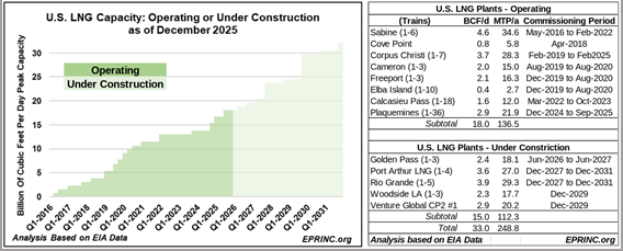 LNG’s 10-Year Roll: LNG producers have increased their commitments either to expansion of current facilities or more new projects. Currently, there is an additional 13.3 BCF/d (101.3 MTP/a) of capacity that has received permitting but has not yet commenced construction. As of December 2025, total operating U.S. LNG export capacity stood at 18 BCF/d, or 136.5 million metric tons per annum (MTP/a). Currently, there is another 15 BCF/d (112.3 MTP/a) that is under construction scheduled to be commissioned between June 2026 and December 2031