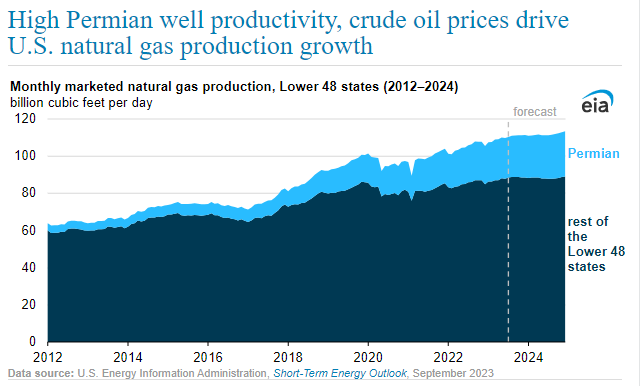 Hydrogen Hub Winners: The EIA says that U.S. marketed natural gas production in the Lower 48 states will grow by 5% (5.0 billion cubic feet per day [Bcf/d]) in 2023 and 2% (1.8 Bcf/d) in 2024 in our latest Short-Term Energy Outlook. Most of the forecast growth comes from the Permian region, where we expect that improved well-level productivity and higher crude oil prices will spur drilling activity that will increase natural gas production.