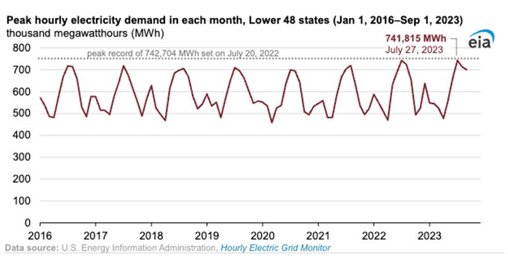 Chart on Electricity Demand: Peak hourly U.S. electricity demand in July was the second highest since 2016 according to EIA. Weather is a large driver of electricity demand, especially in summer months when homes and businesses use electricity for air conditioning. Peak hourly electricity demand in the United States typically occurs in either July or August when demand for space cooling is the highest.