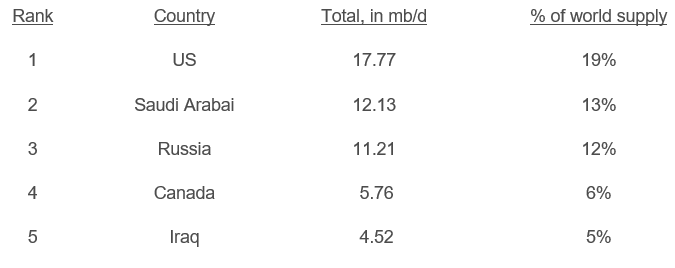 US Still Top Oil Producer: Since 2018, the US has been the world's top oil producer, currently at about 18 mb/d or 1/5th of the total global supply, and 75% of that total comes from five states: Texas, New Mexico, North Dakota, Alaska, and Colorado. (Note: US petroleum exports continue to set records.)
