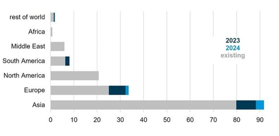 LNG Imports Rolling – Three countries began importing LNG this year (Germany, Philippines, and Vietnam) and next year, Antigua, Australia, Cyprus, and Nicaragua will begin importing LNG. In spite of the fact that importing LNG requires substantial and expensive regasification infrastructure, in the last 10 years global LNG imports have grown 49% across 48 total countries; Asia (with or without China) is by far the fastest growing market. Insert: LNG import capacity by region, in billion cubic feet per day: